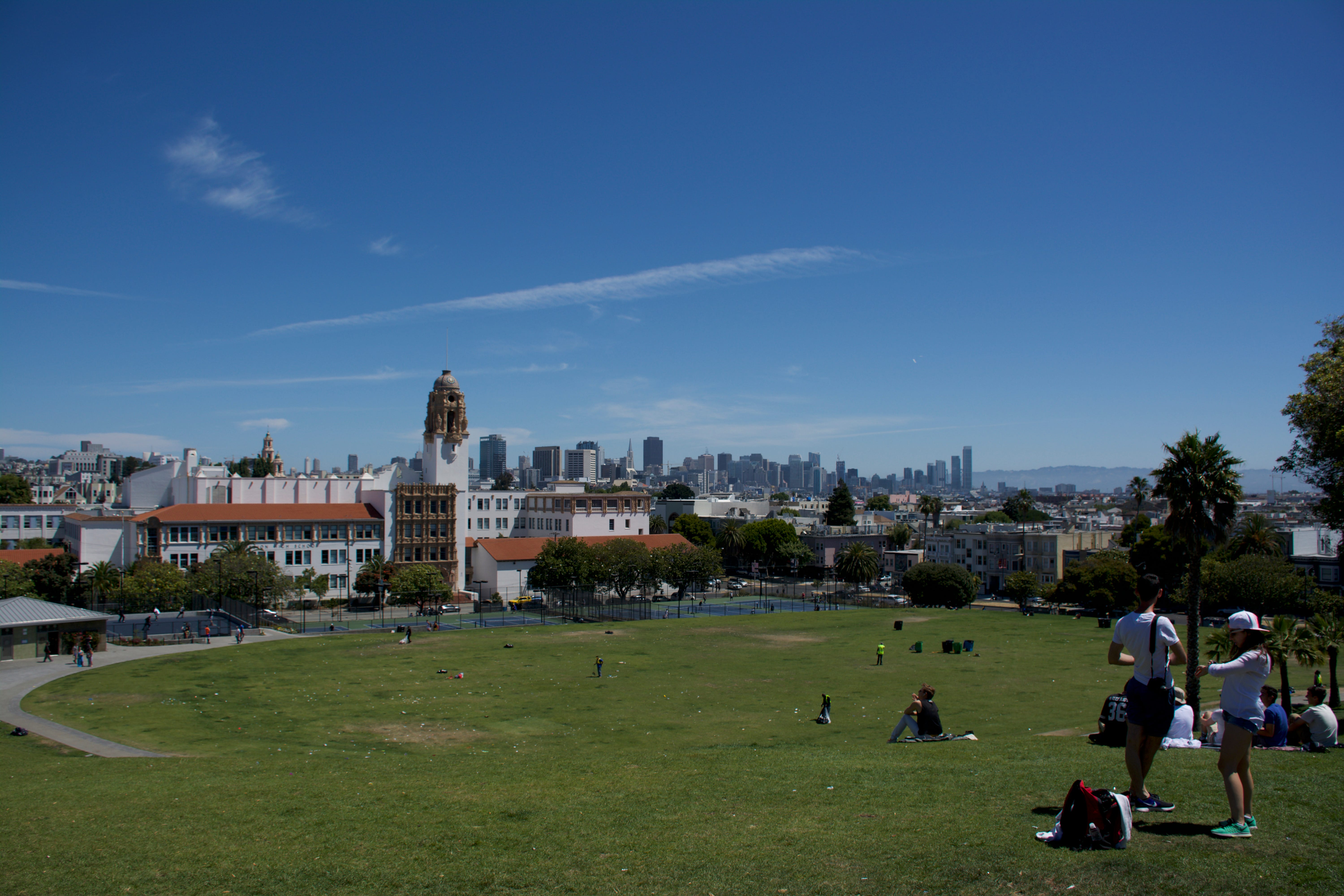 Το κοντινό Dolores Park προσφέρει μία εκπληκτική θέα του συμπλέγματος της ιεραποστολής, και των ουρανοξυστών του Σαν Φρανσίσκο στο βάθος.