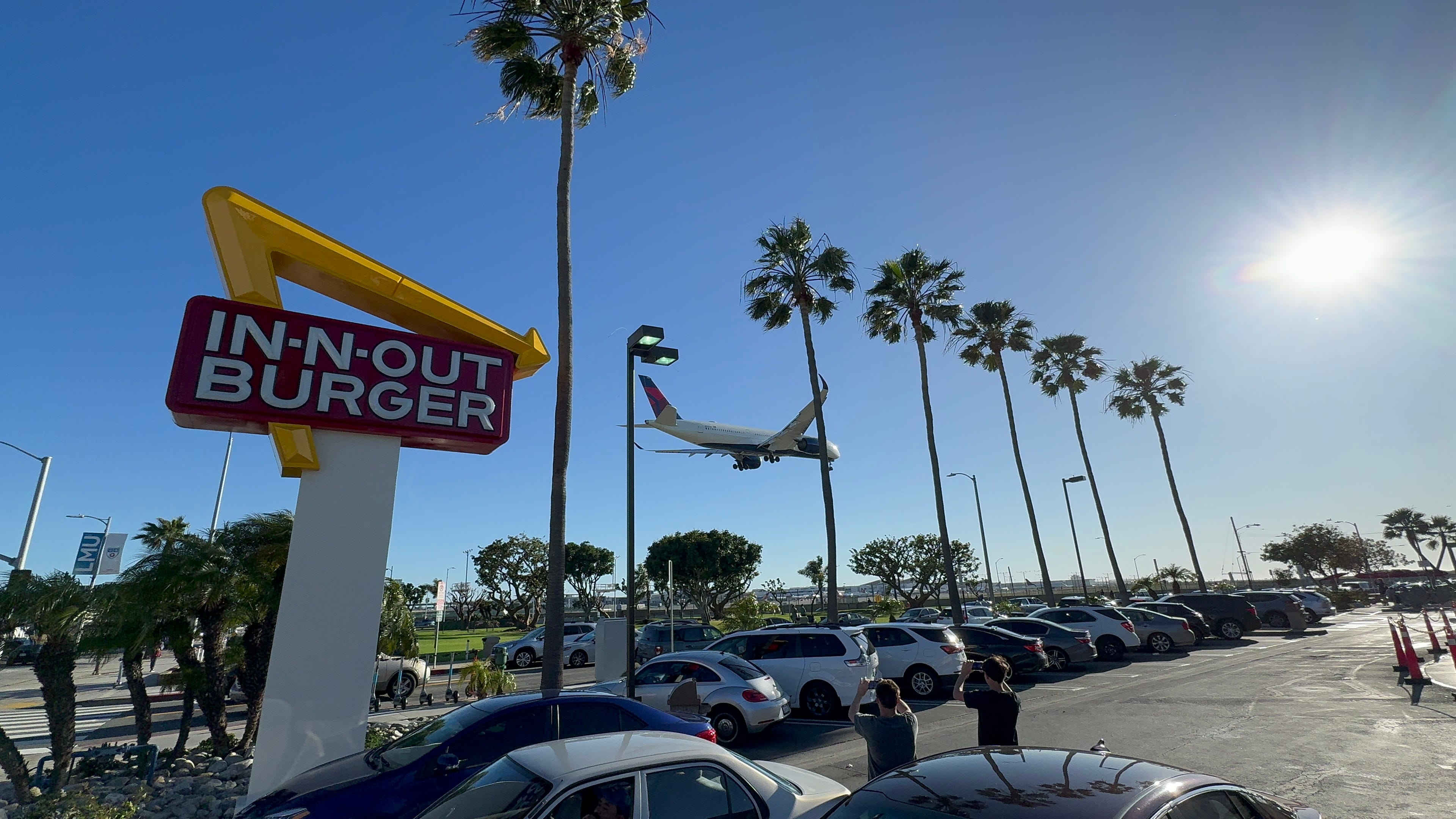Ένα ιδιαίτερο σημείο στην περίμετρο του LAX airport, βασικά στην τελική του διαδρόμου 24R, είναι ένα fast food joint που λέγεται In-N-Out Burger. Είναι μεγάλη αλυσίδα στις ΗΠΑ, αρκετά ποιοτική για αυτή την κατηγορία φαγητού, αλλά το συγκεκριμένο προσελκύει “αεροπλανάκηδες” σαν και του λόγου μου επειδή μπορεί κανείς να θαυμάσει αφίξεις κυριολεκτικά πάνω από το κεφάλι του. Εδώ ένα δείγμα: