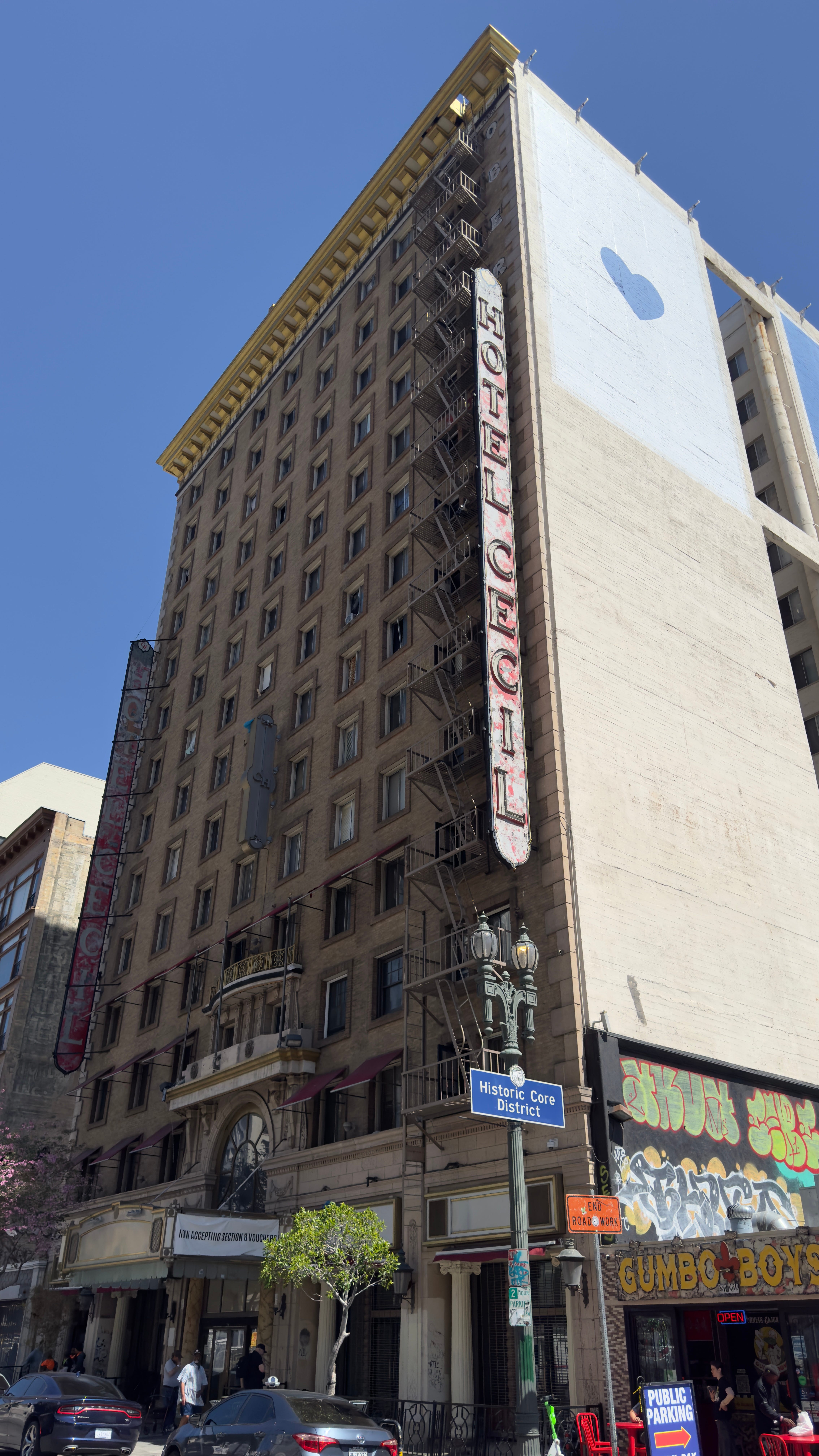 Δεν ξέρω τι γνωρίζετε για το Cecil Hotel στο LA downtown, εγώ δεν γνώριζα μέχρι που μου είπε η κόρη μου ότι είναι διαβόητο για τον αφύσικα μεγάλο αριθμό αυτοκτονιών που έχουν συμβεί εκεί, αλλά και πολλών ανεξήγητων θανάτων. Σήμερα είναι κατοικίες για πολύ χαμηλά εισοδήματα, έχει φυσικά κάκιστη φήμη όπως και όλη η περιοχή εκεί, το περίφημο Skid Row με τους πάρα πολλούς άστεγους. Τόλμησα να σταματήσω απλώς απέναντι για να βγάλω μία φωτογραφία. Yπάρχει μία μίνι σειρά 4 επεισοδίων στο Netflix για αυτό.