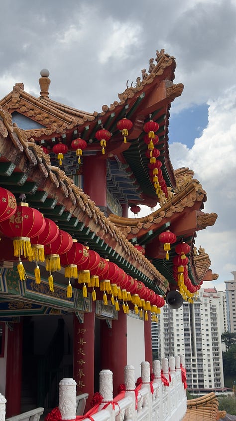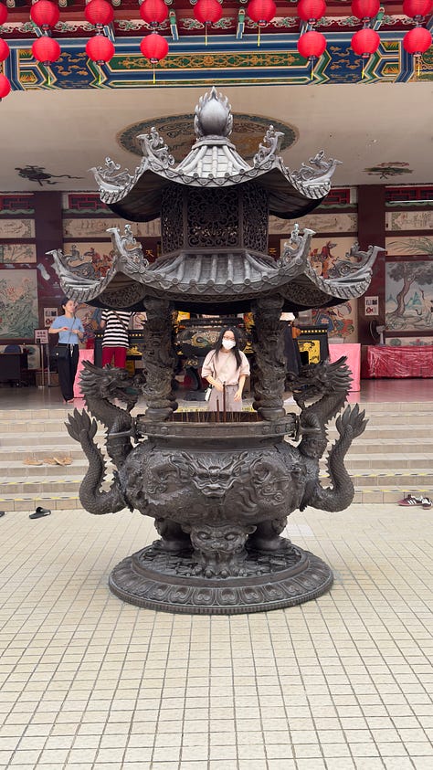 Όταν επισκέφτηκα την πόλη και τον ναό, ήταν οι παραμονές του νέου κινέζικου έτους, που για φέτος είναι η Χρονιά του Φιδιού. Εξ ου και οι ανάλογοι στολισμοί έξω από τον ναό.