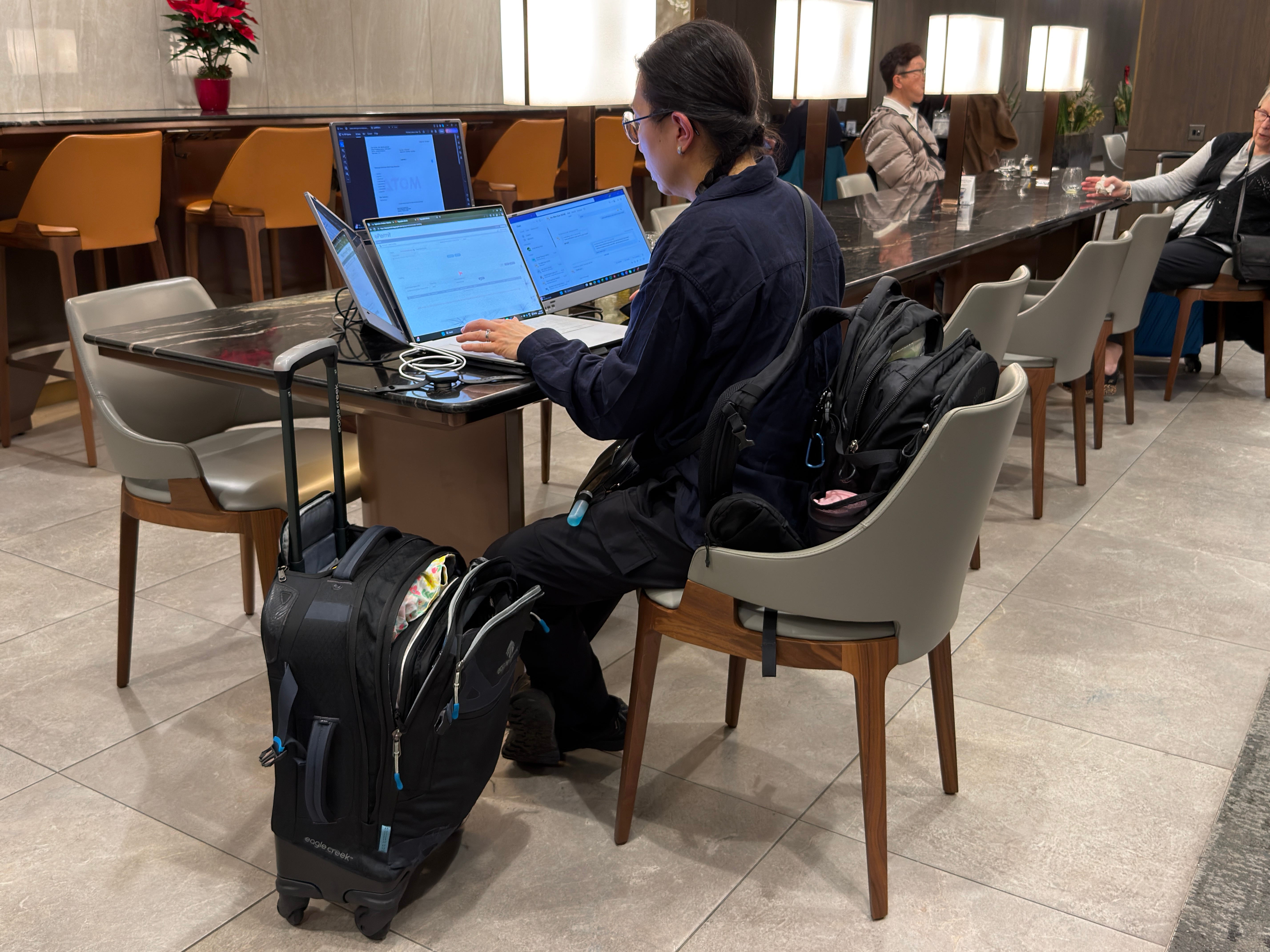 Εάν πάλι θέλετε κάτι πιο… extravagant, υπάρχουν λύσεις με τριπλές οθόνες σε ειδικό πλαίσιο όπου κουμπώνει το laptop, και έχετε την “άπλα” σας. Να, όπως η κυρία εδώ στο SilverKris Lounge της Singapore Airlines στο Terminal 2 του Heathrow: